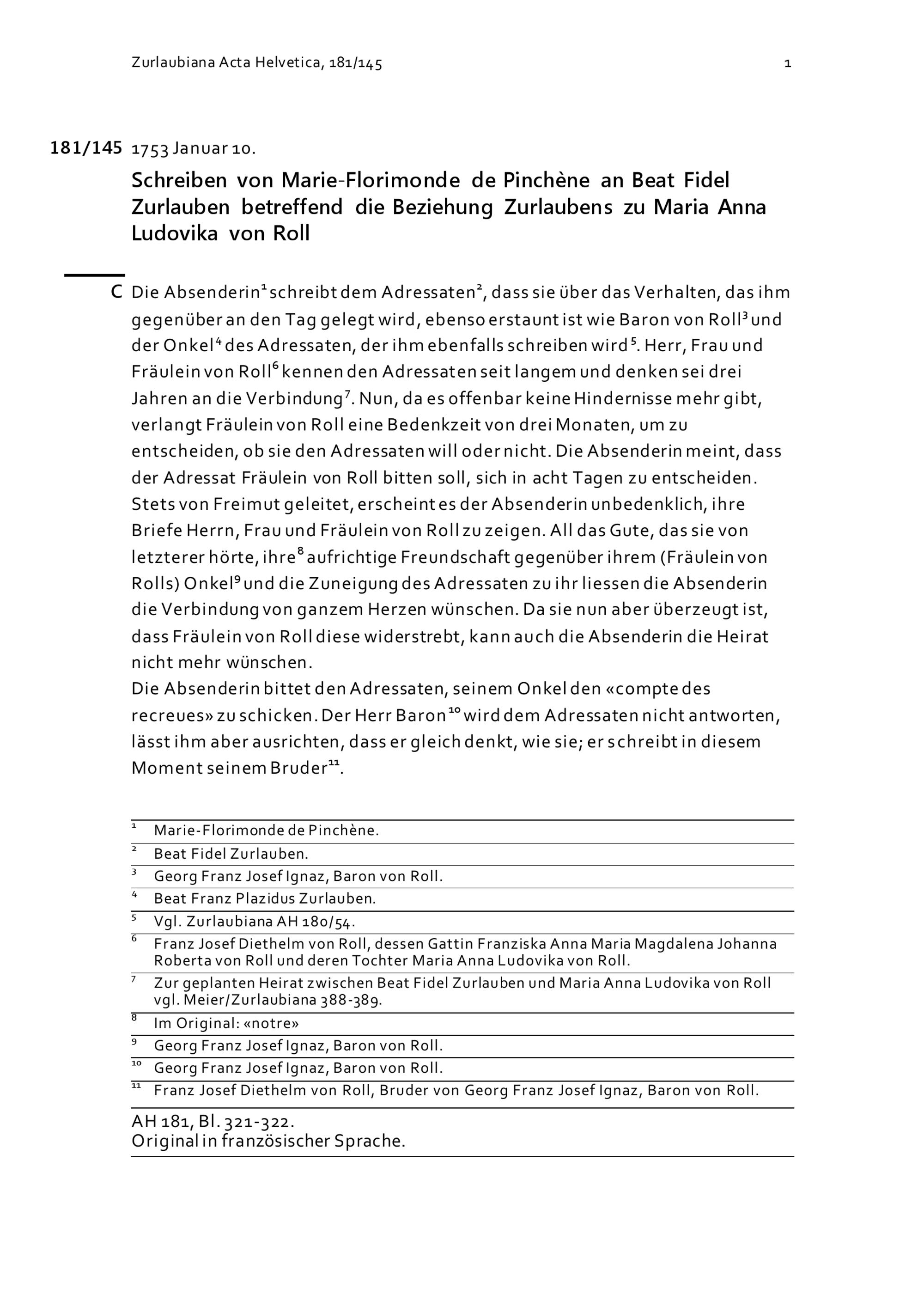 Schreiben von Marie-Florimonde de Pinchène an Beat Fidel Zurlauben betreffend die Beziehung Zurlaubens zu Maria Anna Ludovika von Roll