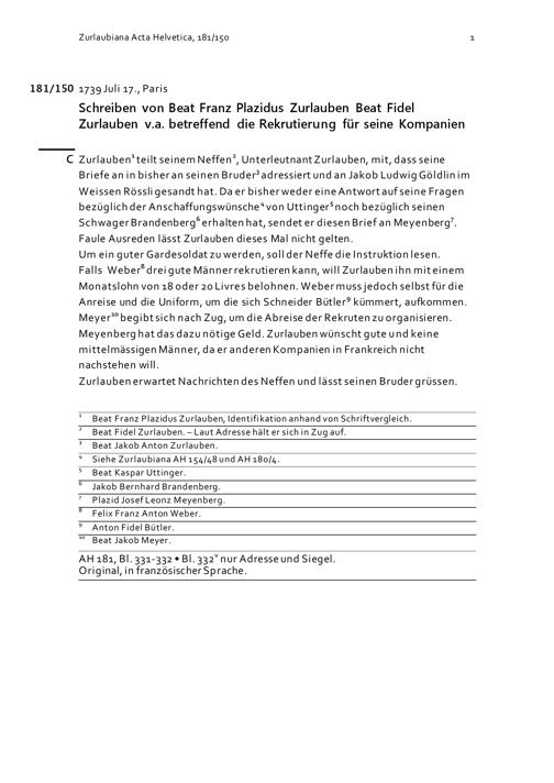Schreiben von Beat Franz Plazidus Zurlauben Beat Fidel Zurlauben v.a. betreffend die Rekrutierung für seine Kompanien