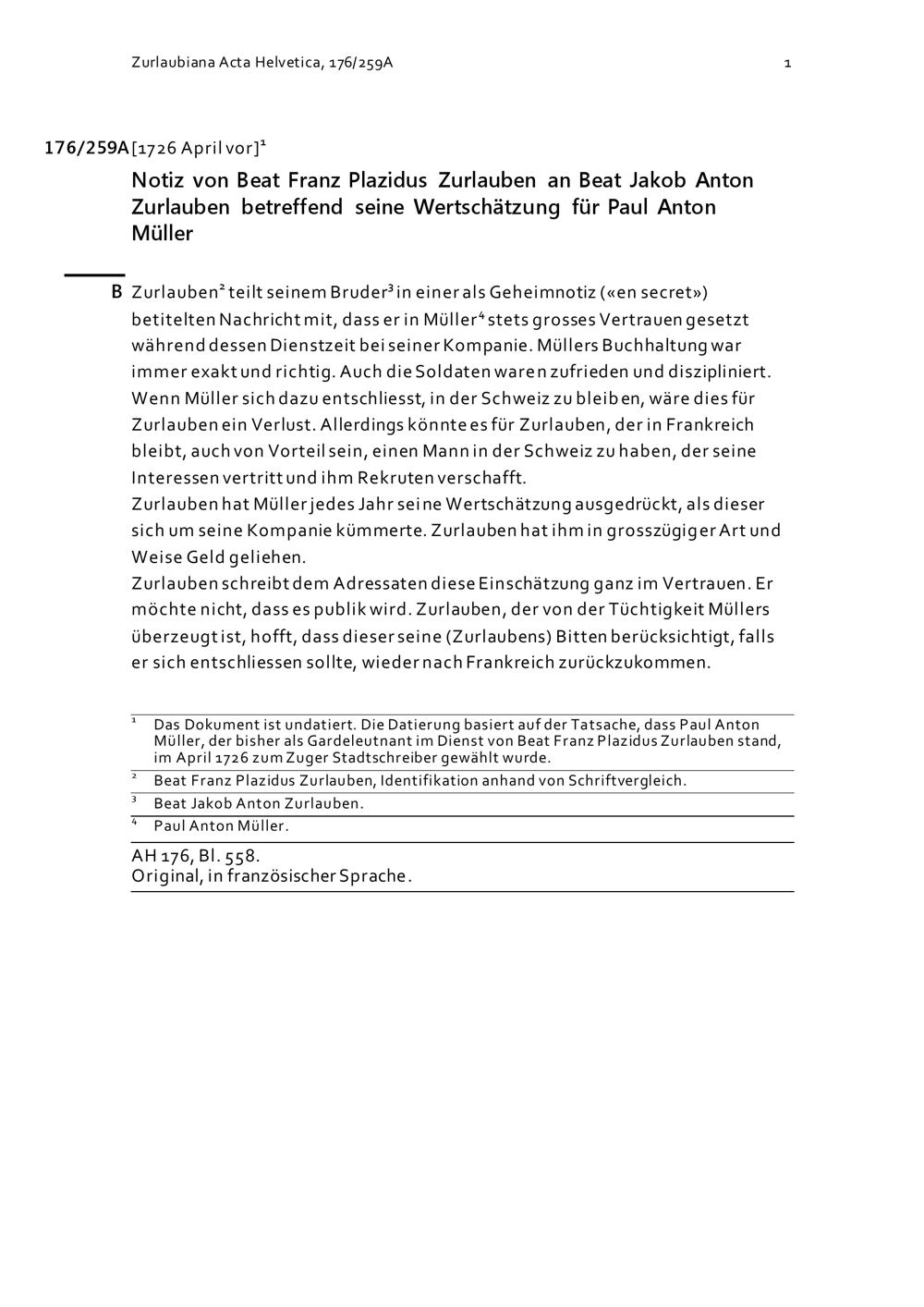 Notiz von Beat Franz Plazidus Zurlauben für Beat Jakob Anton Zurlauben betreffend seine Wertschätzung für Paul Anton Müller