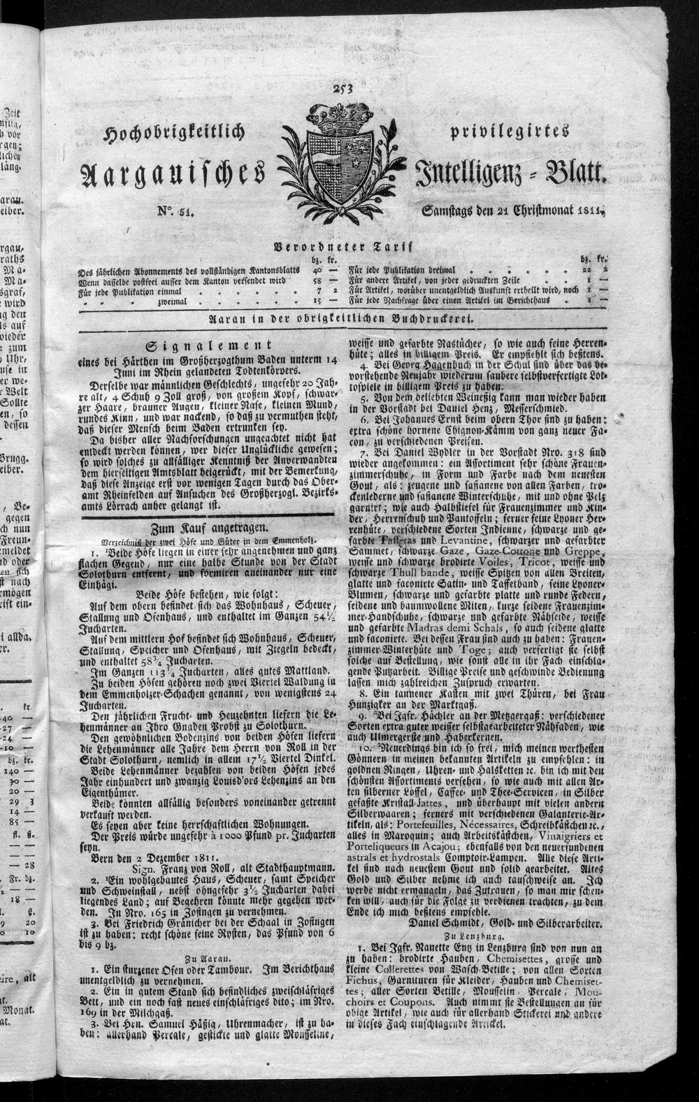 Hochobrigkeitlich privilegirtes Aargauisches Intelligenz-Blatt