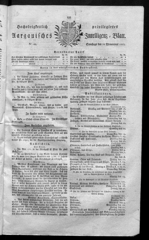 Hochobrigkeitlich privilegirtes Aargauisches Intelligenz-Blatt