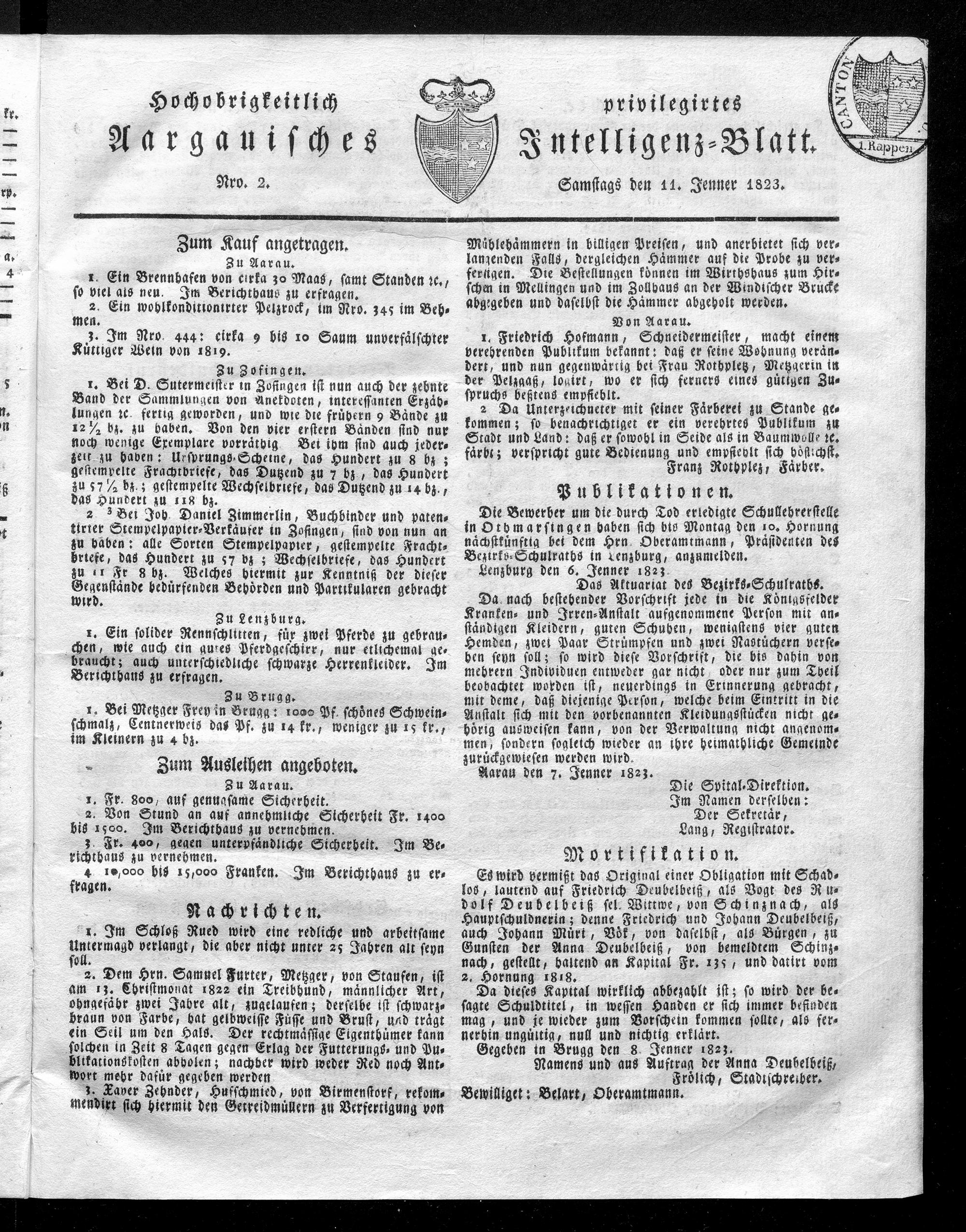 Hochobrigkeitlich privilegirtes Aargauisches Intelligenz-Blatt