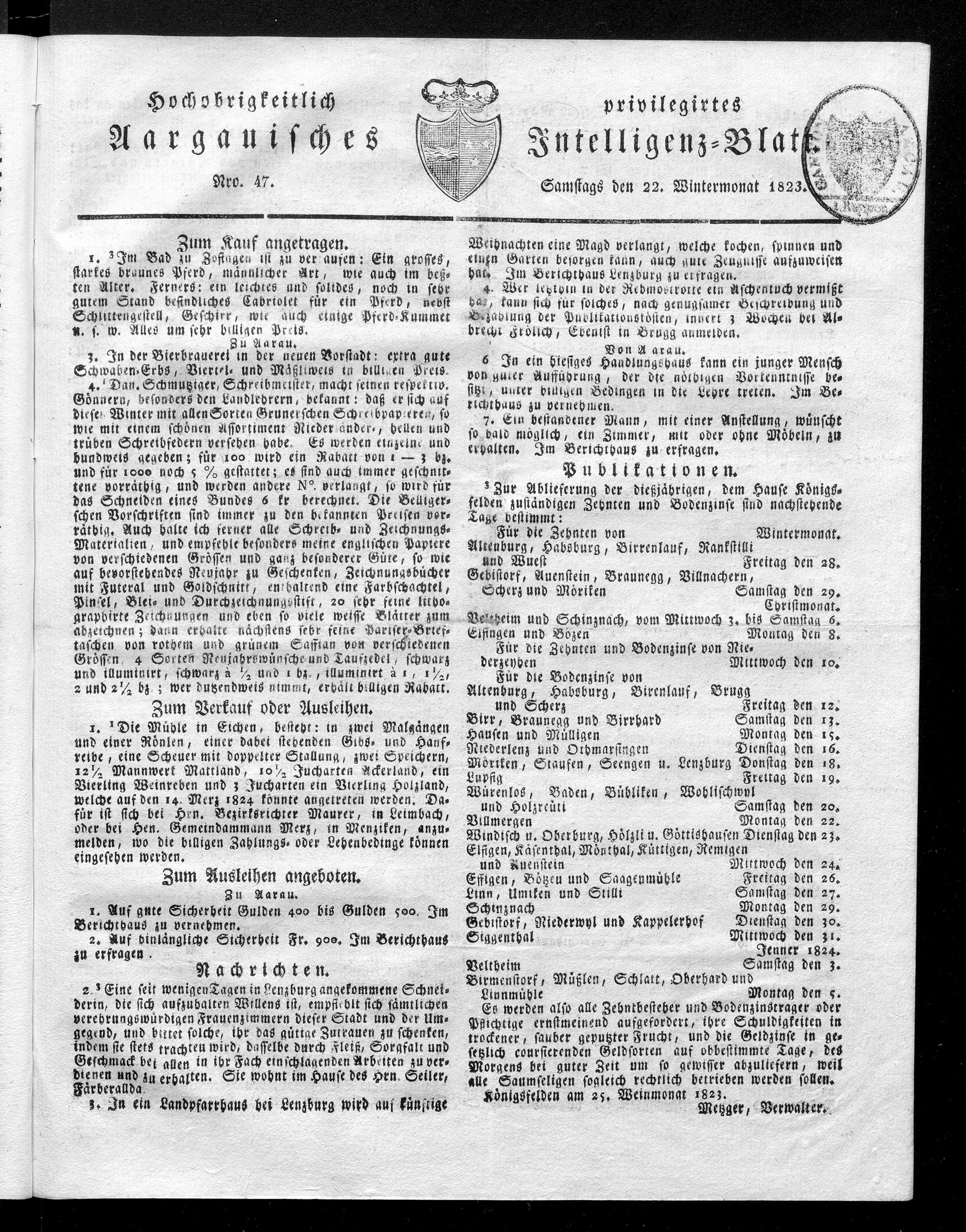 Hochobrigkeitlich privilegirtes Aargauisches Intelligenz-Blatt