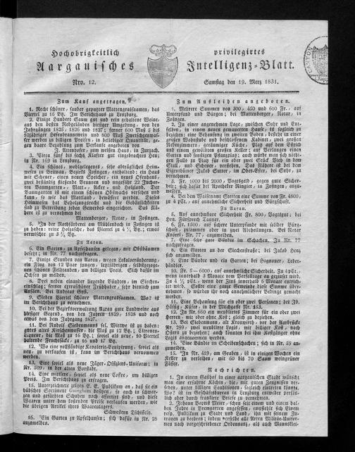 Hochobrigkeitlich privilegirtes Aargauisches Intelligenz-Blatt