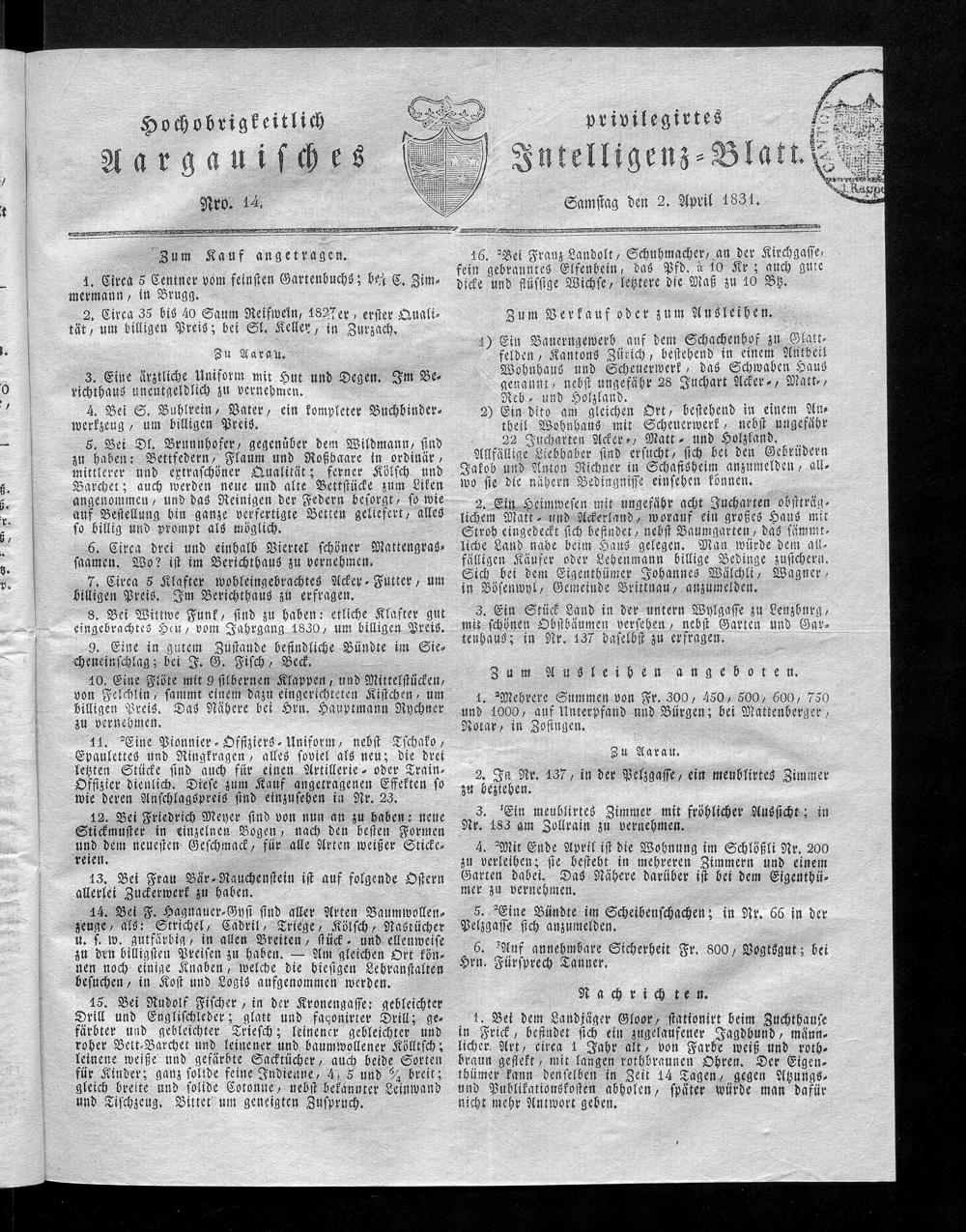 Hochobrigkeitlich privilegirtes Aargauisches Intelligenz-Blatt