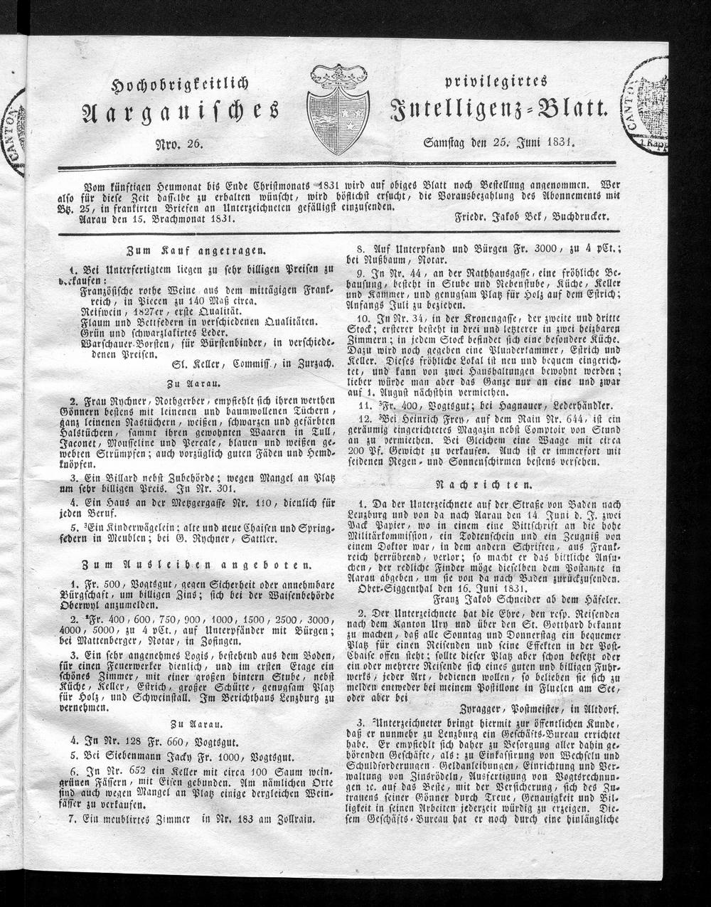 Hochobrigkeitlich privilegirtes Aargauisches Intelligenz-Blatt