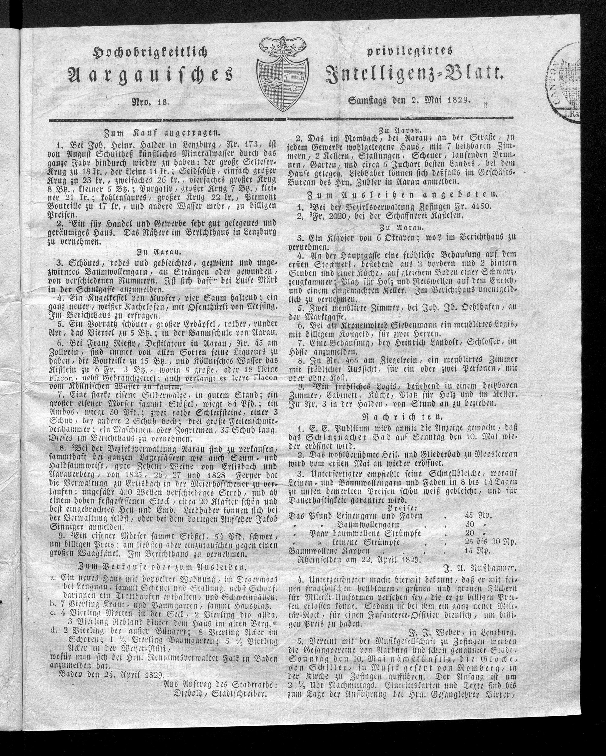 Hochobrigkeitlich privilegirtes Aargauisches Intelligenz-Blatt